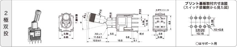 トグルスイッチ(Bシリーズ)・ブラケットマウント形:2極双投・操作部形状:レバーロック形・丸洗い洗浄可能・ソフトな操作フィーリング・レバー倒れ角度が大きい:26度・帯電防止樹脂を採用・スライディングツインクロスバーコンタクト機構採用・端子間ピッチはインチピッチ(2.54MM)採用・使用温度範囲:-30~85℃・用途:OA機器、無線機、業務用ビデオカメラ、交換機、電気測定器、制御盤等・EU-RoHS指令対応 形名:B-22LB
