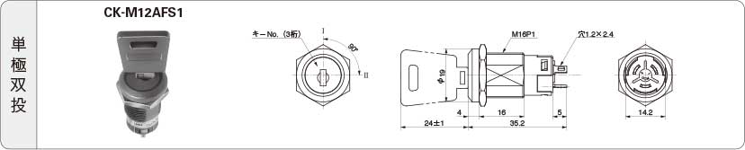 Mタイプ フラットキータイプ キーロックスイッチ(CKシリーズ)・はんだ端子形(銀接点):単極双投・90度ステップ・高いセキュリティ対応:標準対応10種類・打接点摺動接触方式:高接触信頼性と 軽快な操作フィーリング・接触部の高い防塵性能・機能的なデザイン:リバーシブル(無方向性)キー・高静電耐圧:15KV MIN・フラックス等の浸入をシャットアウト・使用温度範囲:-25~70℃・EU-RoHS指令対応 形名:CK-M12AFS1