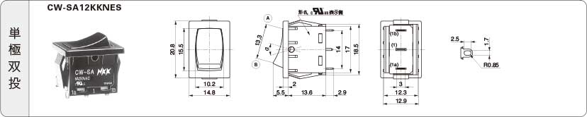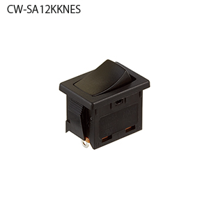 小形全モールドロッカスイッチ(CWシリーズ)・はんだ端子形:単極双投・スナップイン取付け・大きな端子穴(1.7×2.5MM)・高接触信頼性・使用温度範囲:-10~70℃・用途:通信機器、無線応用機器、電子計測器、オートメーション機器、事務用機器、民生用電子機器等・EU-RoHS指令対応 形名:CW-SA12KKNES