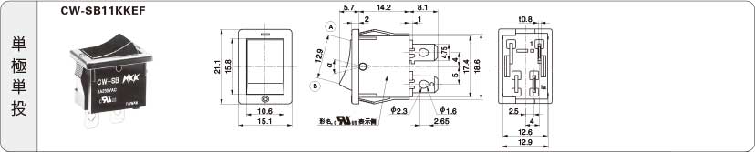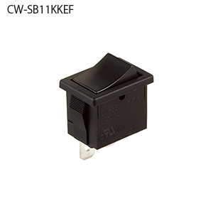 小形全モールドロッカスイッチ(CWシリーズ)・タブ端子形:単極単投・スナップイン取付け・タブ専用端子#187・軽快な操作感・使用温度範囲:-10~70℃・用途:通信機器、無線応用機器、電子計測器、オートメーション機器、事務用機器、民生用電子機器等・EU-RoHS指令対応 形名:CW-SB11KKEF