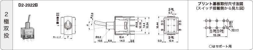 トグルスイッチ(D2シリーズ)・ブラケットマウント形:2極双投・操作部形状:基本レバー・高接触性のスライディングツインクロスバーコンタクト機構採用・UL 94V-0ケース:耐アーク、絶縁、自己消火性に優れる・フラックスの浸入をシャットアウト・作業工程を改善・端子間ピッチはインチピッチ(2.54MM)採用・使用温度範囲:-10~70℃・用途:OA機器、無線機、業務用ビデオカメラ、交換機電気計測器、制御盤等・EU-RoHS指令対応 形名:D2-2022B