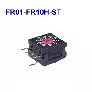フラット形 鉛フリー対応小形ディップロータリスイッチ(FR01シリーズ)・PC-H端子形:2進化10進・コード:リアル・マガジンスティック包装・商品高さ3.8MM(角10MM、全モールドタイプ本体サイズ:2004年4月22日当社調べ)・高信頼性の接触部・キンク曲げ加工端子・使用温度範囲:-25~85℃・用途:FA/OA機器、無線機、通信機器、業務用ビデオカメラ、電子計測機器、制御盤、民生用電子機器、アミューズメント機器等・EU-RoHS指令対応 形名:FR01-FR10H-ST