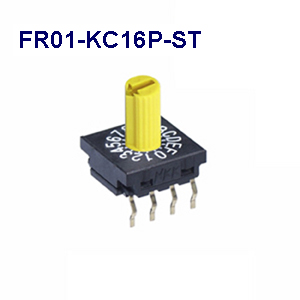ツマミ形 鉛フリー対応極超小形ディップロータリスイッチ(FR01シリーズ)・PC端子形:2進化16進・コード:コンプリメンタリ・マガジンスティック包装・高信頼性の接触部・キンク曲げ加工端子・使用温度範囲:-25~85℃・用途:FA/OA機器、無線機、通信機器、業務用ビデオカメラ、電子計測機器、制御盤、民生用電子機器、アミューズメント機器等・EU-RoHS指令対応 形名:FR01-KC16P-ST