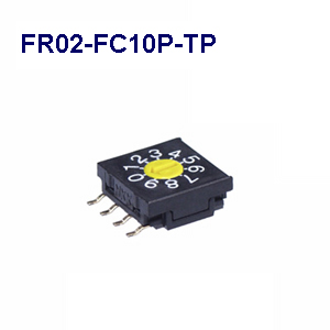 フラット形 鉛フリー対応小形ディップロータリスイッチ(FR02シリーズ)・SMT対応PC端子形:2進化10進・コード:コンプリメンタリ・キャリアテープ包装・全モールドタイプでは業界最薄の商品高さ3.8MM(角10MM、全モールドタイプ本体サイズ:2004年4月22日当社調べ)・高信頼性の接触部・端子形状はガルウィング式を採用・高耐熱性樹脂を採用:リフロー等によるはんだ付けが可能・使用温度範囲:-25~85℃・用途:FA/OA機器、無線機、通信機器、業務用ビデオカメラ、電子計測機器、制御盤、民生用電子機器、アミューズメント機器等・EU-RoHS指令対応 形名:FR02-FC10P-TP