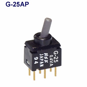 トグルスイッチ(Gシリーズ)・PC端子形:2極双投・操作部形状:基本レバー・丸洗い洗浄可能・ソフトな操作フィーリング・フラックスの浸入をシャットアウト・レバー倒れ角度が大きい:28度・スライディングツインクロスバーコンタクト機構採用・全モールドタイプで静電耐圧に優れる・端子間ピッチはインチピッチ(2.54MM)採用・使用温度範囲:-25~85℃・用途:OA機器、無線機、業務用ビデオカメラ、交換機、電気計測器、制御盤等・EU-RoHS指令対応 形名:G-25AP