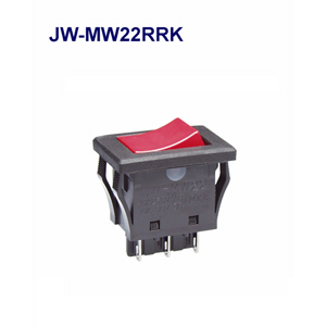 MWタイプ全モールドロッカスイッチ(防水形)JWシリーズ・はんだ端子、タブ端子:2極双投・本体色:黒・操作部色:赤・パネル防水(IP67適合)・スナップイン取付け・DC定格に対応・フラックスの浸入をシャットアウト・軽快な切換え動作・使用温度範囲:-25~85℃・用途:通信機器/無線応用装置、電子計測器、オートメーション機器、事務用機器、民生用電子機器等・EU-RoHS指令対応 形名:JW-MW22RRK