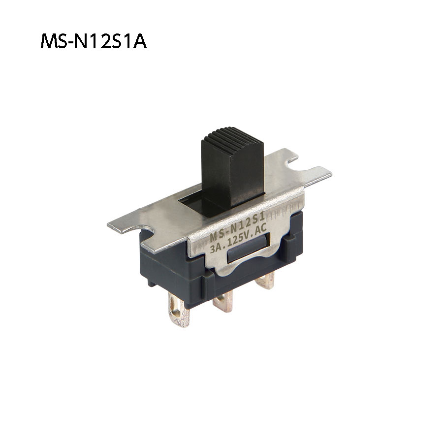 非照光式スライドスイッチ(Mシリーズ)・はんだ端子形(銀接点):単極双投・フラックス浸入対策・連続取付が可能・はぎれの良い操作感覚・操作性、視認性のよい大きなストローク・UL 94V-0のケース・使用温度範囲:-30~85℃・EU-RoHS指令対応 形名:MS-N12S1A