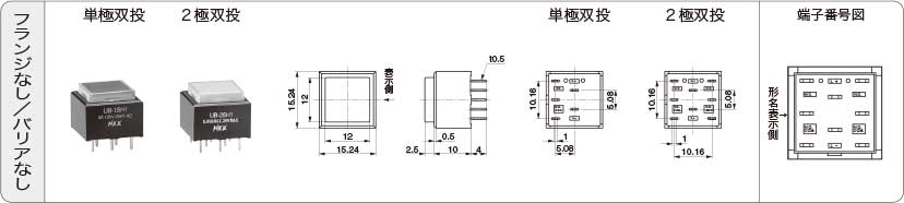 角形照光式押ボタンスイッチ(UBシリーズ)・PC端子形(銀接点):2極双投・機能動作:モーメンタリ・スイッチ形状:フランジなし/バリアなし・超高輝度(レベル2)LED色:緑・フラックスの浸入をシャットアウト・ロングストローク軽快な操作感・操作部は別売り・使用温度範囲:-25~50℃・用途:通信機器、無線応用装置、電子計測器、事務用機器オートメーション機器、民生用電子機器等・EU-RoHS指令対応 形名:UB-25H2SKP1M