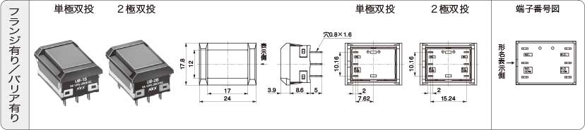 長角形押ボタンスイッチ(UBシリーズ)・はんだ端子形(銀接点):2極双投・機能動作:モーメンタリ形・スイッチ形状:フランジ有り/バリア有り(スナップイン)・超短胴形(高さ17.5MM)・豊富なカラーバリエーション・文字、記号等の表示可能・フラックスの浸入をシャットアウト・高密度実装が可能・ロングストロークで軽快な操作感・操作部は別売り・使用温度範囲:-25~70℃・用途:通信機器、無線応用装置、電子計測器、事務用機器オートメーション機器、民生用電子機器等・EU-RoHS指令対応 形名:UB-25NBKS1N