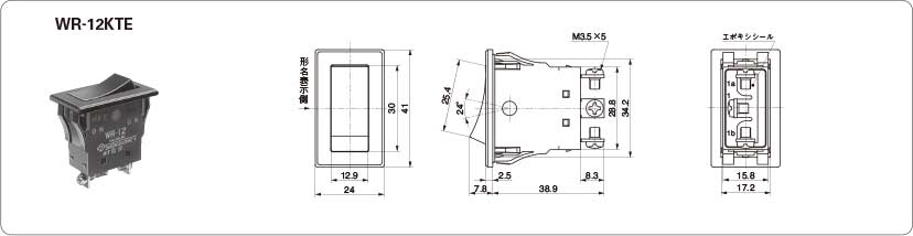 ロッカスイッチ(Wシリーズ)・ねじ端子シールタイプ:単極双投・パネル防水タイプ・操作部の色:黒・デザイン性の向上・ワンタッチ取り付け・強制開離機構・EN-61058-1クラスII適合・難燃性、絶縁性に優れたケース:UL 94V-0認定品・バウンス防止機構・使用温度範囲:-25~85℃用途:工作機械、輸送機器、建築・土木機器、食品機械、厨房機器等・EU-RoHS指令対応 形名:WR-12KTE