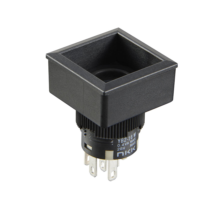 角形照光式押ボタンスイッチ(YB2シリーズ)・はんだ端子形(金メッキ接点):単極双投・機能動作:ロック形・操作部形状:ねじ取付けタイプ・超高輝度対応・パネル前面高さ1.8MM・パネルシール防水・豊富な発光素子群・フラックス等の浸入をシャットアウト・文字/記号等の表示可能・フランジの色:黒・省スペース化に貢献・ロングストロークで軽快な操作感・はんだ/タブ兼用端子・操作部ボタン及び発光素子は別売り・使用温度範囲:-25~50℃・用途:通信機器・無線応用装置、電子計測器、事務用機器、民生用電子機器、FA機器、医療機器等・EU-RoHS指令対応 形名:YB2-16CWSKG4