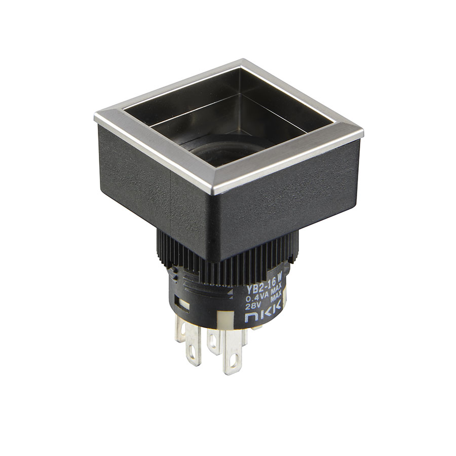 角形照光式押ボタンスイッチ(YB2シリーズ)・はんだ端子形(金メッキ接点):単極双投・機能動作:ロック形・操作部形状:角形・ねじ取付けタイプ・超高輝度対応・パネル前面高さ1.8MM・パネルシール防水・豊富な発光素子群・フラックス等の浸入をシャットアウト・文字/記号等の表示可能・フランジの色:ステンレス調・省スペース化に貢献・ロングストロークで軽快な操作感・はんだ/タブ兼用端子・操作部ボタン及び発光素子は別売り・使用温度範囲:-25~50℃・用途:通信機器/無線応用装置、電子計測器、オートメーション機器、事務用機器、民生用電子機器等・EU-RoHS指令対応 形名:YB2-16CWSPG4