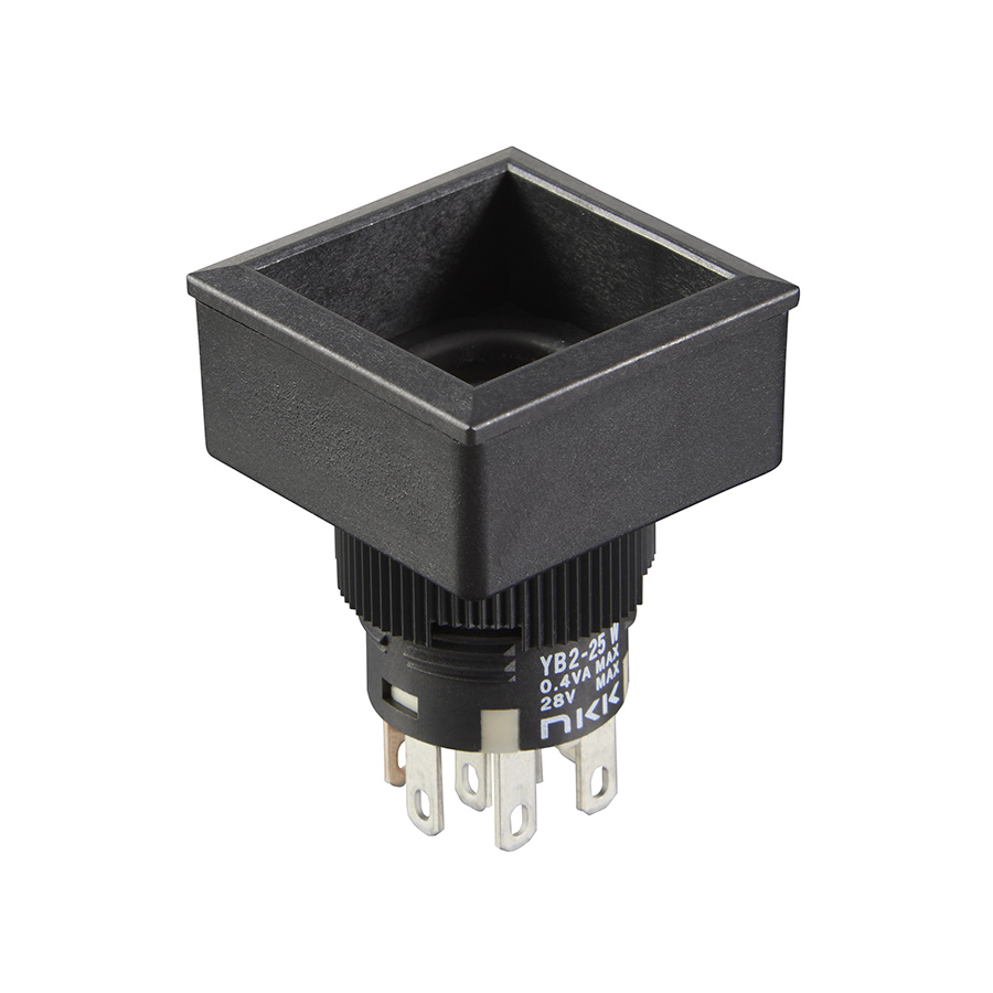 角形照光式押ボタンスイッチ(YB2シリーズ)・はんだ端子形(金メッキ接点):2極双投・機能動作:モーメンタリ形・操作部形状:ねじ取付けタイプ・超高輝度対応・パネル前面高さ1.8MM・パネルシール防水・豊富な発光素子群・フラックス等の浸入をシャットアウト・文字/記号等の表示可能・フランジの色:黒・省スペース化に貢献・ロングストロークで軽快な操作感・はんだ/タブ兼用端子・操作部ボタン及び発光素子は別売り・使用温度範囲:-25~50℃・用途:通信機器・無線応用装置、電子計測器、事務用機器、民生用電子機器、FA機器、医療機器等・EU-RoHS指令対応 形名:YB2-25CWSKG4