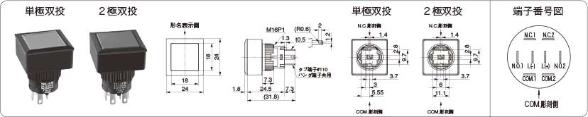 角形照光式押ボタンスイッチ(YB2シリーズ)・はんだ端子形(銀接点):2極双投・機能動作:モーメンタリ形・操作部形状:ねじ取付けタイプ・超高輝度対応・パネル前面高さ1.8MM・パネルシール防水・豊富な発光素子群・フラックス等の浸入をシャットアウト・文字/記号等の表示可能・フランジの色:黒・省スペース化に貢献・ロングストロークで軽快な操作感・はんだ/タブ兼用端子・操作部ボタン及び発光素子は別売り・使用温度範囲:-25~50℃・用途:通信機器・無線応用装置、電子計測器、事務用機器、民生用電子機器、FA機器、医療機器等・EU-RoHS指令対応 形名:YB2-25CWSKS1