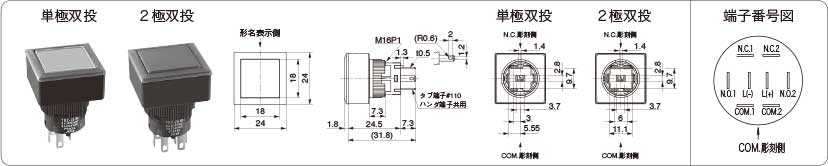角形照光式押ボタンスイッチ(YB2シリーズ)・はんだ端子形(銀接点):2極双投・機能動作:モーメンタリ形・操作部形状:角形・ねじ取付けタイプ・超高輝度対応・パネル前面高さ1.8MM・パネルシール防水・豊富な発光素子群・フラックス等の浸入をシャットアウト・文字/記号等の表示可能・フランジの色:ステンレス調・省スペース化に貢献・ロングストロークで軽快な操作感・はんだ/タブ兼用端子・操作部ボタン及び発光素子は別売り・使用温度範囲:-25~50℃・用途:通信機器/無線応用装置、電子計測器、オートメーション機器、事務用機器、民生用電子機器等・EU-RoHS指令対応 形名:YB2-25CWSPS1