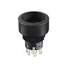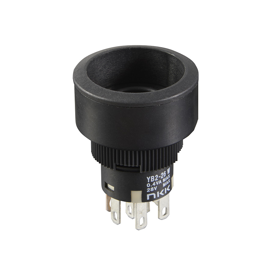 丸形照光式押ボタンスイッチ(YB2シリーズ)・はんだ端子形(金メッキ接点):2極双投・機能動作:ロック形・操作部形状:ねじ取付けタイプ・超高輝度対応・パネル前面高さ1.8MM・パネルシール防水・豊富な発光素子群・フラックス等の浸入をシャットアウト・文字/記号等の表示可能・フランジの色:黒・省スペース化に貢献・ロングストロークで軽快な操作感・はんだ/タブ兼用端子・操作部ボタン及び発光素子は別売り・使用温度範囲:-25~50℃・用途:通信機器/無線応用装置、電子計測器、オートメーション機器、事務用機器、民生用電子機器等・EU-RoHS指令対応 形名:YB2-26CWCKG4